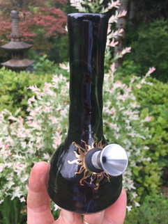 Ancient Creations Ceramics Mini Water Pipes with Glass, or Metal, are apprx. 5 inches tall, and come with your choice of a one piece glass bowl/downtube, or your standard metal parts, and they both have a carb in the back! #minibings All of our Water Pipes are hand formed on the pottery wheel from pure white porcelain! They are then hand painted inside and out with 100% food safe glazes, hand decorated with real platinum and gold lusters, and finished with real 22 karat gold sunshine designs! The sturdy, wide based, beaker style design sits safely flat on any surface, and allows for the best percolation!